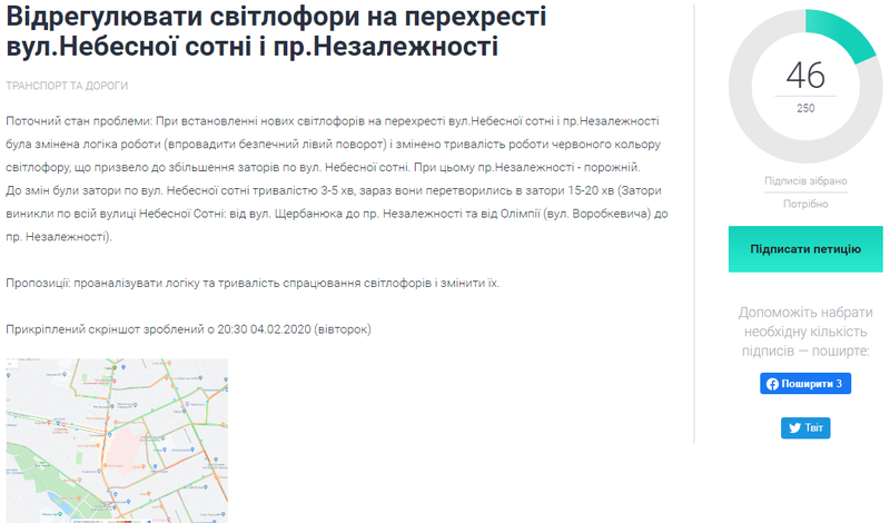 На сайті Чернівецької міської ради 5 лютого 2020 року зареєстрували нову петицію щодо відрегулювання світлофорів на перехресті вул. Небесної сотні і пр. Незалежності.