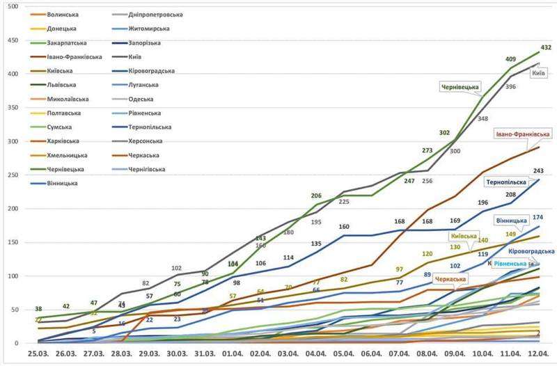 “Станом на 12 квітня найбільш стрімке поширення коронавірусної хвороби зафіксовано у Чернівецькій області (432 випадки) та місті Києві (416 випадків). Ці регіони є лідерами з кількості випадків COVID-19 з самого початку епідемії. На третьому місці – Івано-Франківська область (291 випадок)”, – зазначили у відомстві.