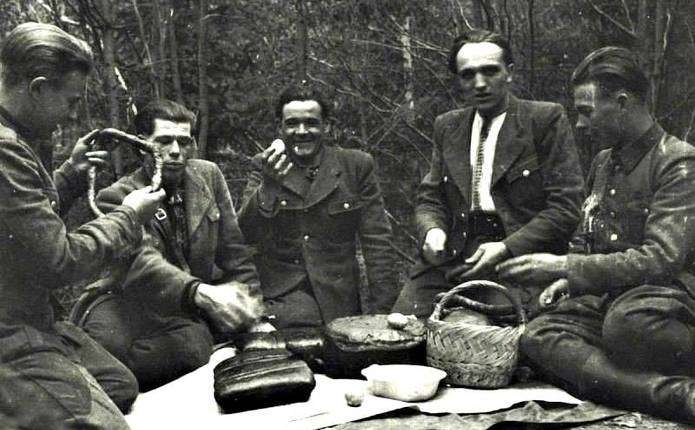 Ось зі старих фото бачимо, яким був Великдень в УПА. У лісі накривали саморобні столи з грубих дощок, застелені хвоєю-скатертиною. Не завжди було безпечно піти святкувати у ближні до лісу села чи привозити священника. Тож в особливо небезпечні часи молитовною трапезою керував командир, але у будь-якому разі Великдень не зводився до простого споживання їди – надто величним був цей день. Іноді біда диктувала так, що обрядової їди як такої не було взагалі. Але Великдень був у серці.