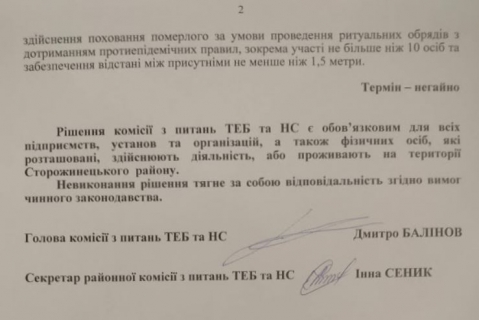 Сьогодні, 24 квітня 2020 року, відбулося позачергове засідання районної комісії з питань ТЕБ та НС, на якому було зобов’язано Сторожинецьку, Великокучурівську, Чудейську, Красноїльську громади та сільські ради району заборонити відвідування кладовищ у післяпасхальні (післявеликодні) поминальні дні, крім випадків здійснення поховання померлого.
