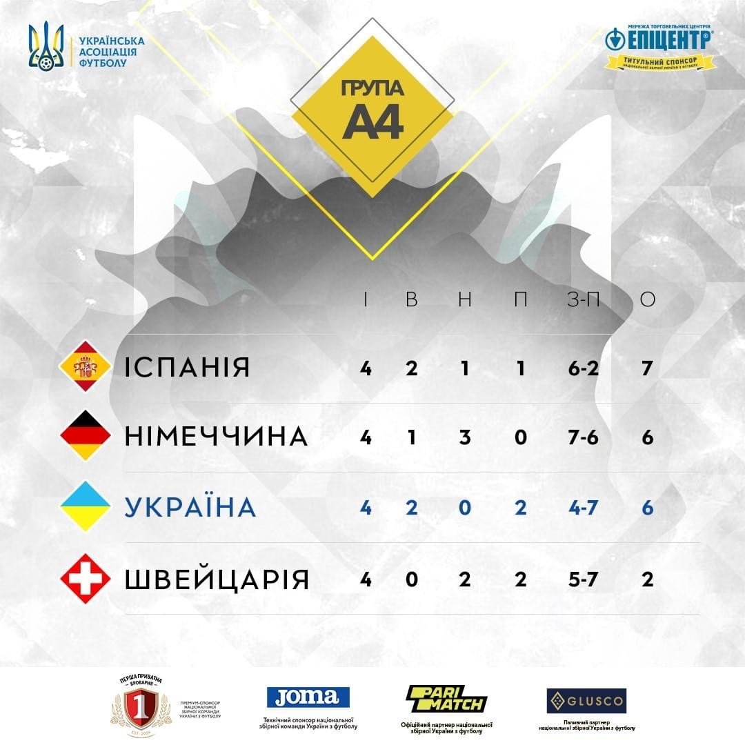 Після чотирьох турів у групі 4 збірна України набрала вже шість очок, тому команда посідає третю позицію. На першому місці у турнірній таблиці Іспанія (7 очок), на другому — Німеччина (6 очок), а замикає таблицю Швейцарія — у неї 2 бали.