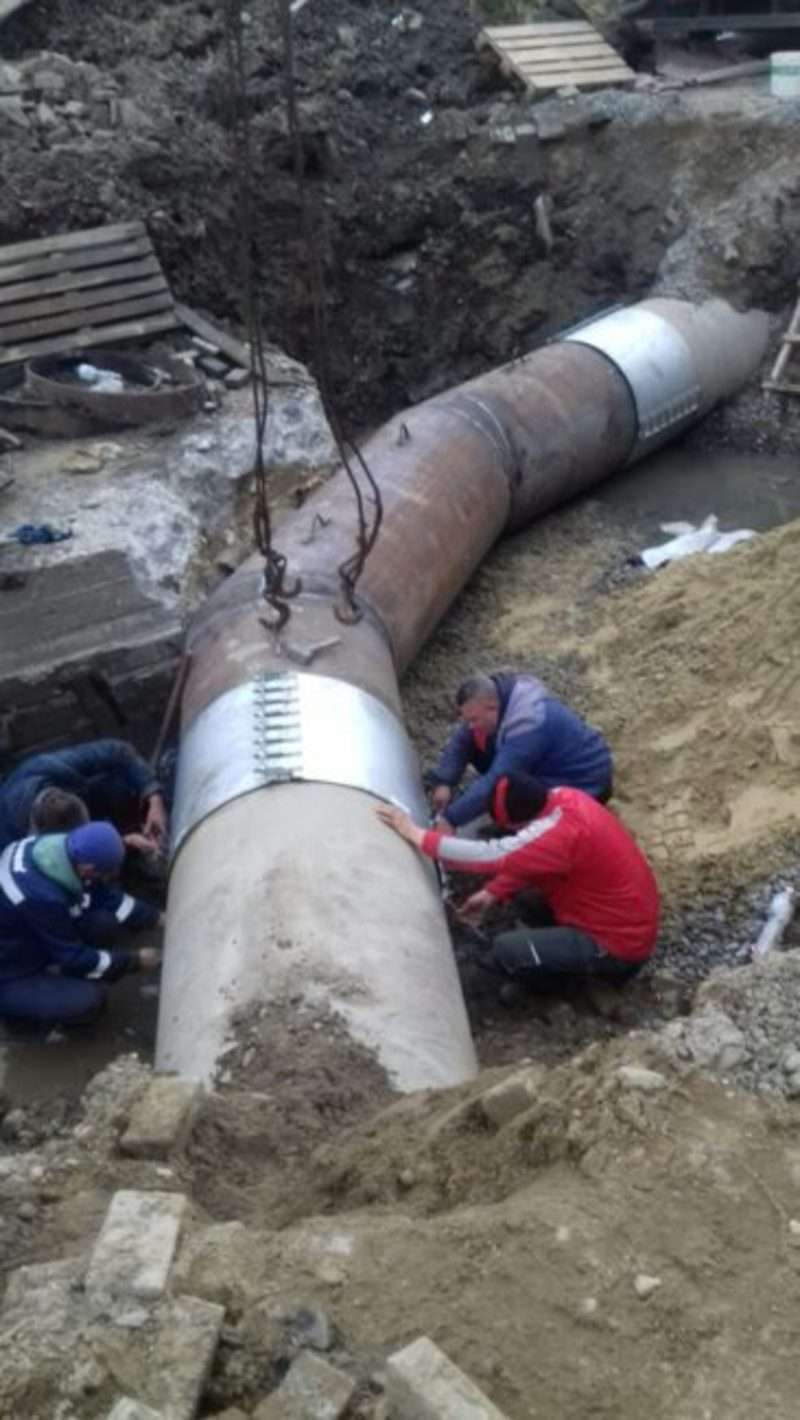 Співробітники КП «Чернівціводоканал» закінчили зварювати сегменти стальної труби в суцільний шматок та спеціальними хомутами прикріпили його до ділянки водогону діаметром 1000 мм за адресою проспект Незалежності, 116В. Оскільки основна магістраль на цій ділянці побудована зі скловолокна, хомути – це єдиний спосіб прикріпити сегмент до загальної гілки водогону, повідомляє vodokanal.cv.ua.