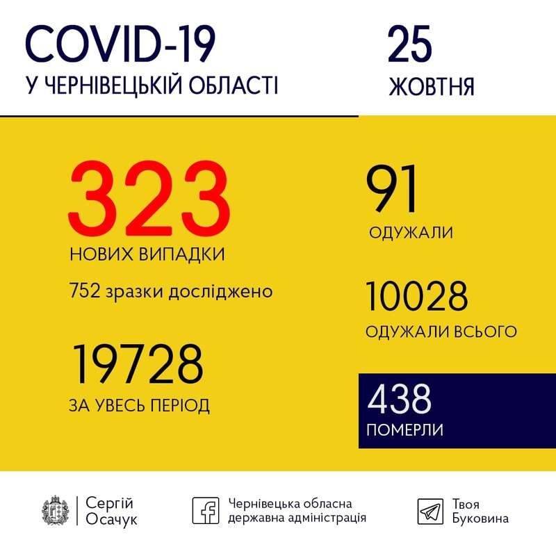 Одужали цього дня 91 особа. Таким чином з початку пандемії у Чернівецькій області діагностували 19728 випадків захворювання на коронавірус, 10028 осіб одужали, 438 людей померли.