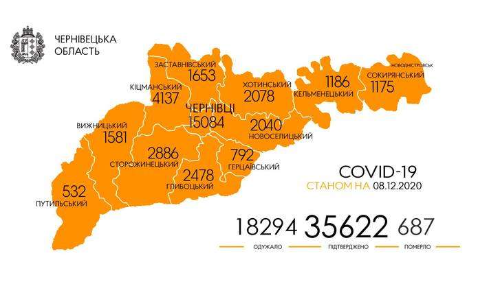 За весь період (станом на 8 грудня 2020 р.) у Чернівецькій області підтверджено 35622 випадки зараження коронавірусом, повідомляє Чернівецька ОДА.