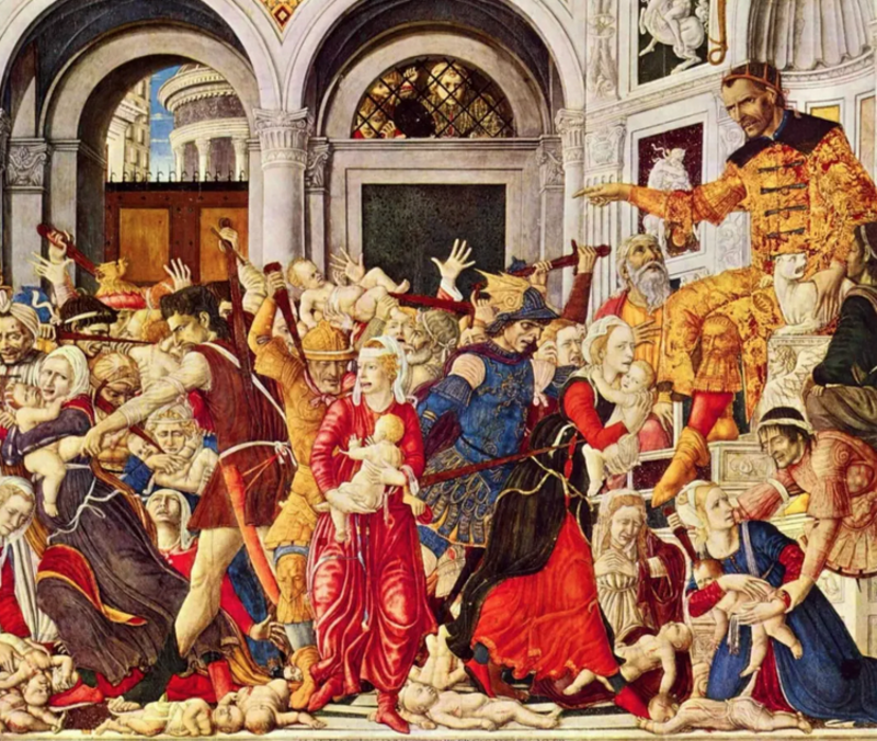 Згідно з Євангелієм від Матвія, волхви, які прибули зі своїми дарами поклонитися новонародженому Ісусу Христу, відмовилися розповісти царю Іудеї Іроду про місцезнаходження Спасителя. Тоді в люті Ірод наказав убити всіх немовлят віком до двох років у Вифлеємі. Трагедію передбачив ще старозавітний пророк Єремія в 7-6 століттях до н. е.; церква вшановує убитих як мучеників. Ісус тоді. був врятований, завдяки ангелу, який явився чоловіку Діви Марії Йосипу і велів бігти з родиною до Єгипту.