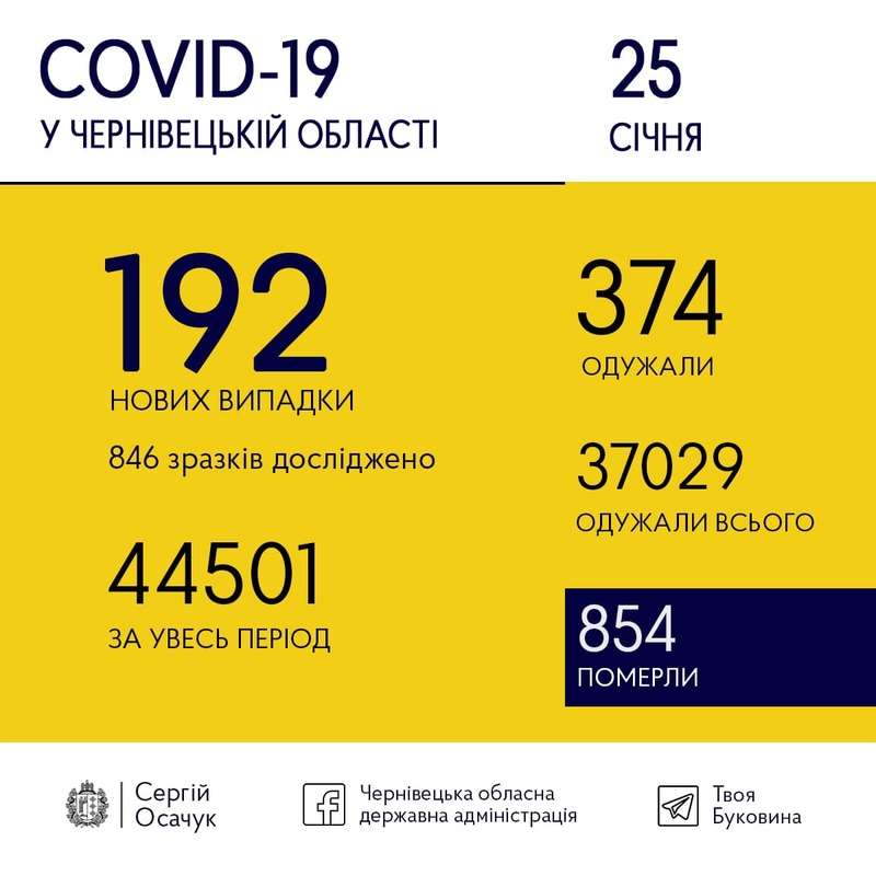 25 січня на Буковині виявили 192 нових випадки коронавірусу.