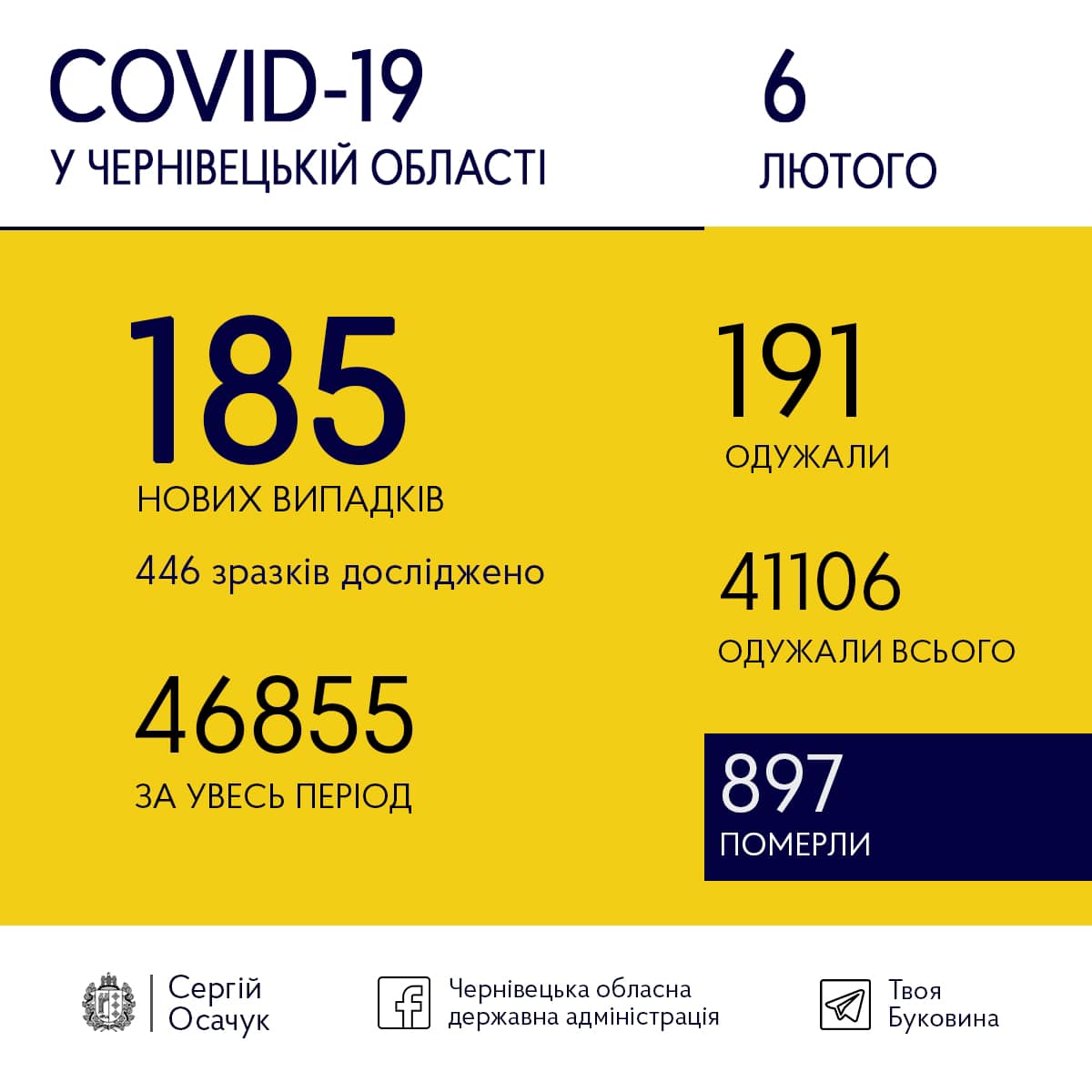 Станом на 7 лютого на Буковині виявили 185 нових випадків коронавірусу. Одужала за добу 191 людина.