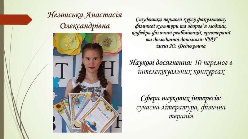 • Анастасія Незвиська – студентка першого курсу факультету фізичної культури та здоров’я людини, кафедра фізичної реабілітації, ерготерапії та домедичної допомоги ЧНУ імені Юрія Федьковича (ІІ місце, секція «Зарубіжна література»).