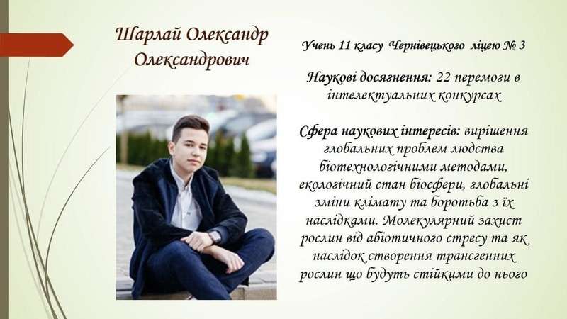 • Олександр Шарлай – учень 11 класу Чернівецького ліцею №3 медичного профілю (ІІ місце, секція «Загальна біологія»);