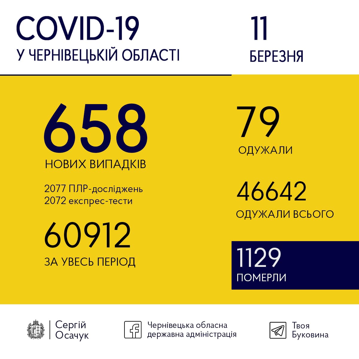 На Буковині минулої доби, як повідомив у фейсбуку голова Чернівецької ОДА Сергій Осачук, зафіксували 658 нових випадків COVID-19. При цьому провели 2077 ПЛР-досліджень та 2072 експрес-тести.