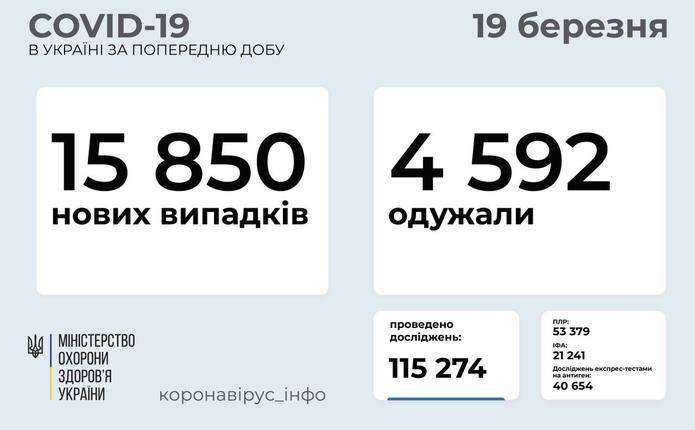 15 850 нових випадків коронавірусної хвороби COVID-19 зафіксовано в Україні станом на 19 березня 2021 року. Зокрема, захворіли 830 дітей та 401 медпрацівник. Про це інформує телеграм-канал Коронавірус Інфо.