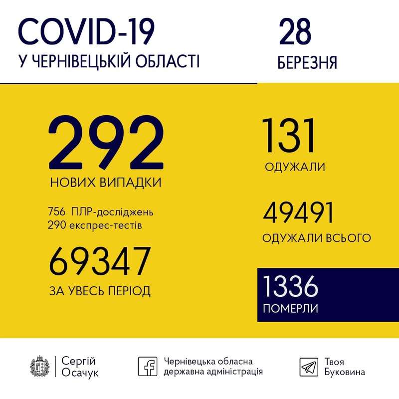 28 березня на Буковині виявили 292 нових випадки коронавірусу.