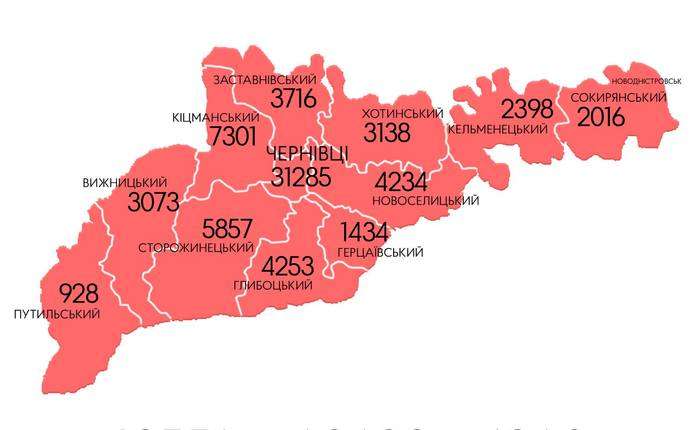 Найбільше інфікованих у Чернівцях (31285), Кіцманському (7301), Сторожинецькому (5857), Глибоцькому (4253), Новоселицькому (4234), Заставнівському (3716), Хотинському (3138) районах. Найменше людей заразилися на Путильщині (928).