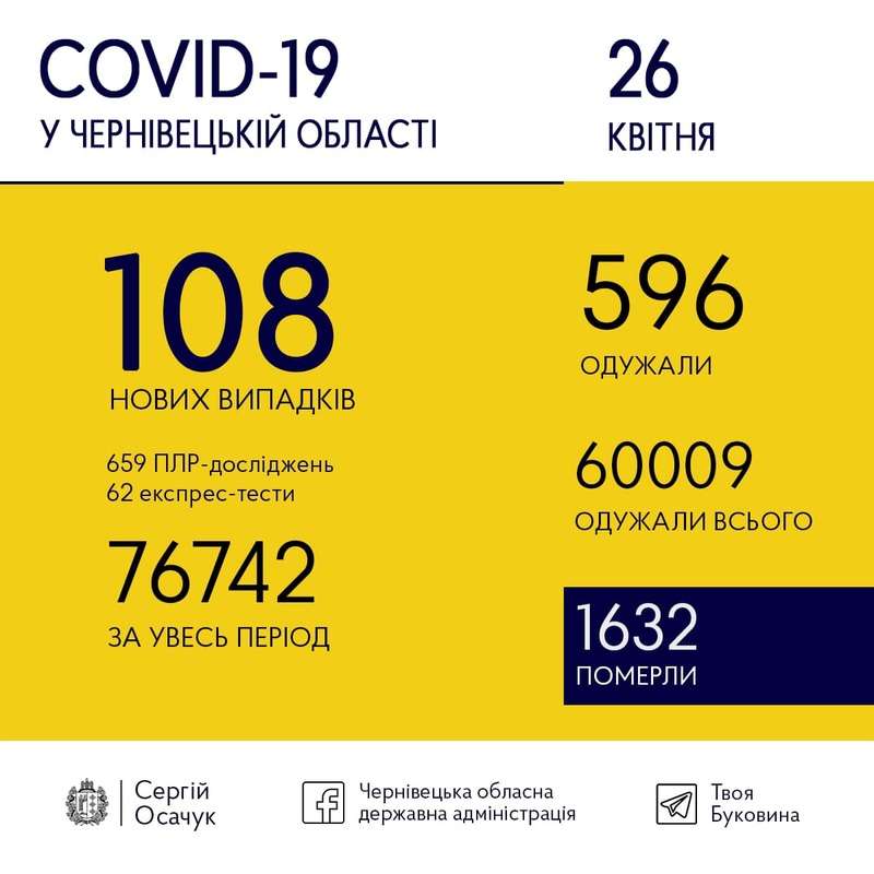 26 квітня на Буковині виявили 108 нових випадків коронавірусу.