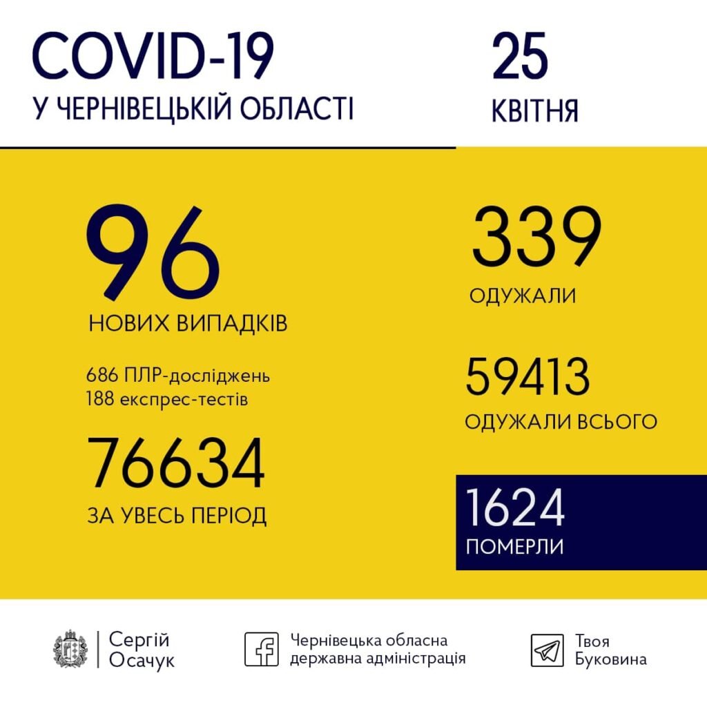 На Буковині за минулу добу зареєстрували 96 нових випадків коронавірусу. Одужали за добу 339 осіб. Про це повідомив голова Чернівецької обласної держадміністрації Сергій Осачук.