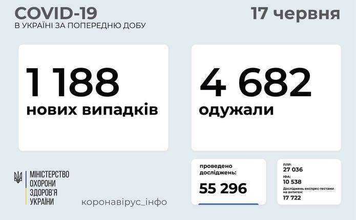 1 188 нових випадків коронавірусної хвороби COVID-19 зафіксовано в Україні станом на 17 червня 2021 року. Зокрема, захворіли 62 дитини та 6 медичних працівників. Про це інформує телеграм-канал Коронавірус Інфо.