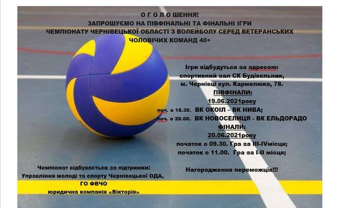 19-20 червня у спортивному залі СК «Будівельник» (вул. Кармелюка, 78) відбудуться півфінальні та фінальні ігри волейбольного чемпіонату Чернівецької області серед ветеранських чоловічих команд 40+. Про це повідомляє chernivtsisport.com.