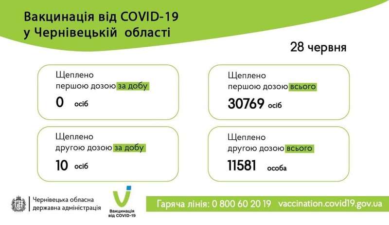 Загалом у Чернівецькій області від коронавірусу станом на 28 червня першою дозою вакцинували 30769 буковинців, другу дозу отримали 11581 особа.