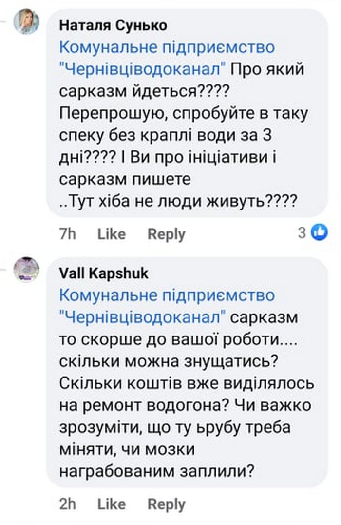 У коментарях чернівчанка Ольга Спіріна запитала чи під кожен будинок будуть підвозити воду, на, що отримала у коментарях погрози з боку працівників «Чернівціводоканалу», що за такі коментарі, район взагалі залишиться без водопостачання навіть спецавтомобілями.