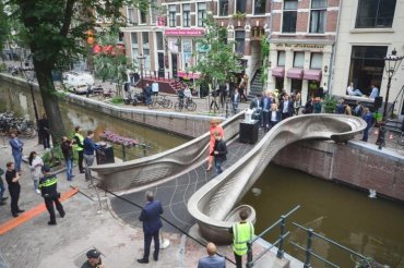 В Амстердаме установили 12-метровый стальной мост — первый в мире, напечатанный на 3D-принтере. Он соединяет берега канала Аудезийдс Ахтербургвал и открыт для пешеходов и велосипедистов, пишет Daily mail.