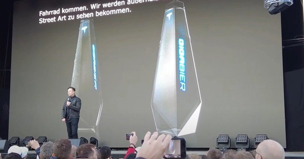 «Ми збираємося побудувати вокзал просто на території підприємства. Ми зробимо графіті по всій фабриці і зовні. Ми навіть збираємося випити пива», — сказав Маск, а позаду нього з’явилося зображення пляшки «Tesla GigaBier».
