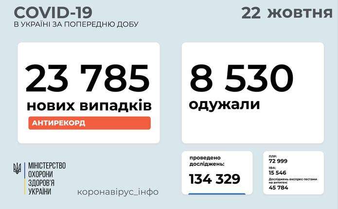 23 785 нових випадків COVID-19 зафіксовано в Україні станом на 22 жовтня 2021 року. Зокрема, захворіли 1800 дітей та 391 медпрацівник. Про це йдеться у Telegram-каналі “Коронавірус-інфо”.