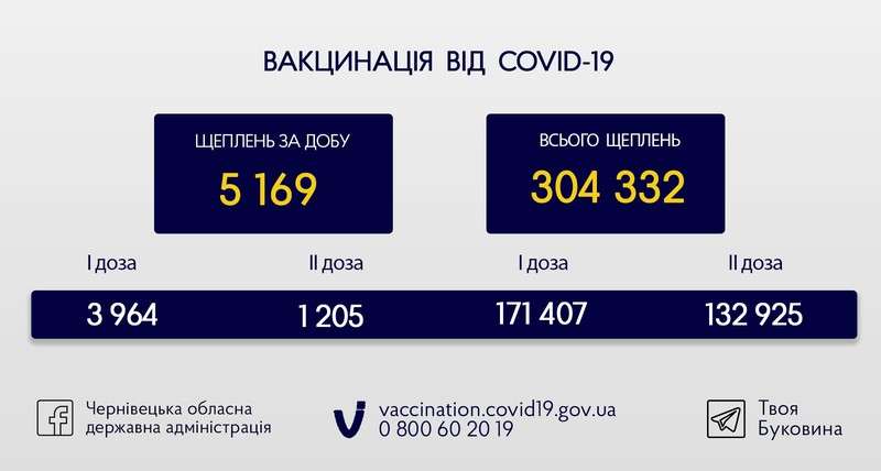 За весь період на Буковині зробили 304 332 щеплення, з них першою дозою імунізувалися 171 407 людей, другою – 132 925.