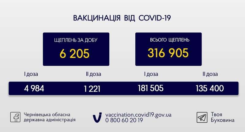 Крім того, за минулу добу в області зробили 6205 щеплень від COVID-19, першою дозою вакцинувалися 4984 осіб, другою – 1221. За весь період на Буковині зробили 316 905 щеплень, з них першою дозою імунізувалися 181505 людей, другою – 135400.