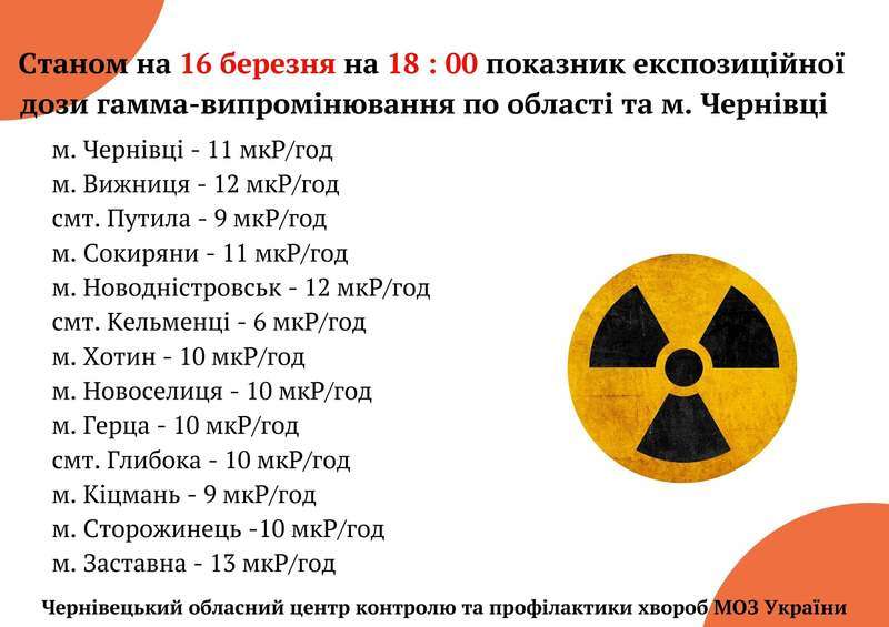 Станом на 16 березня на 18:00 показник дози гамма-випромінювання у Чернівцях та у Чернівецькій області в нормі та не перевищує 13 мкг/годину.
