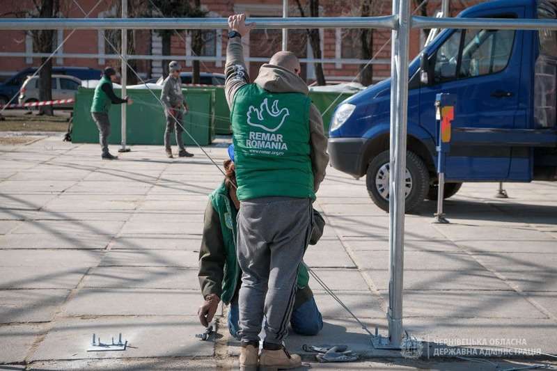 Павільйони конструюють іспанські доброчинці – представники благодійної організації Remar. Тут люди, що прибули в область, рятуючись від жахіть війни, зможуть отримати гаряче харчування, продукти, одяг та іншу допомогу. Про це повідомляє пресслужба Чернівецької ОВА у Facebook.
