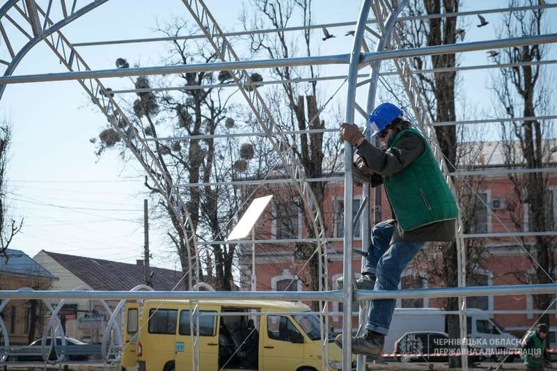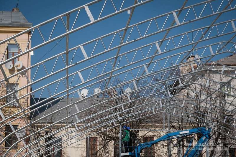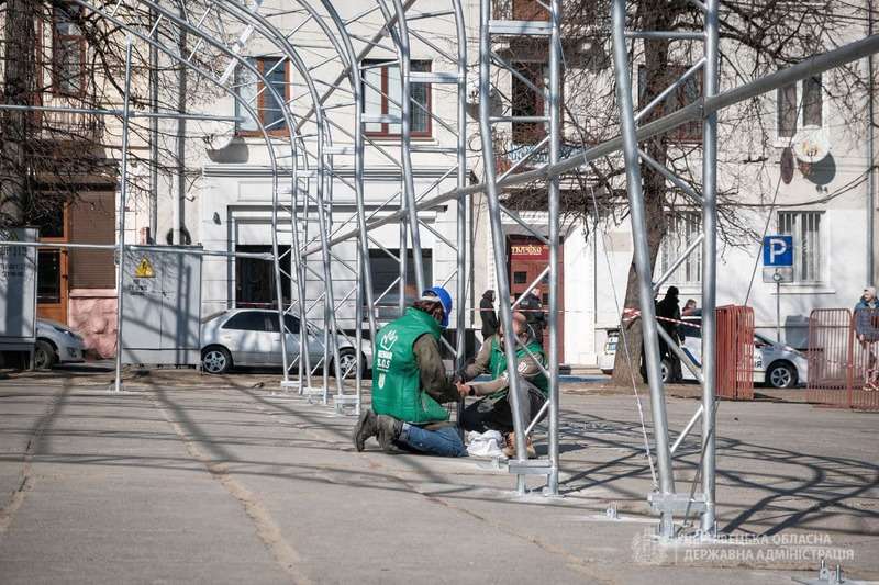 Велику гуманітарну базу, де надаватимуть допомогу переселенцям, зводять на Соборній площі у Чернівцях.