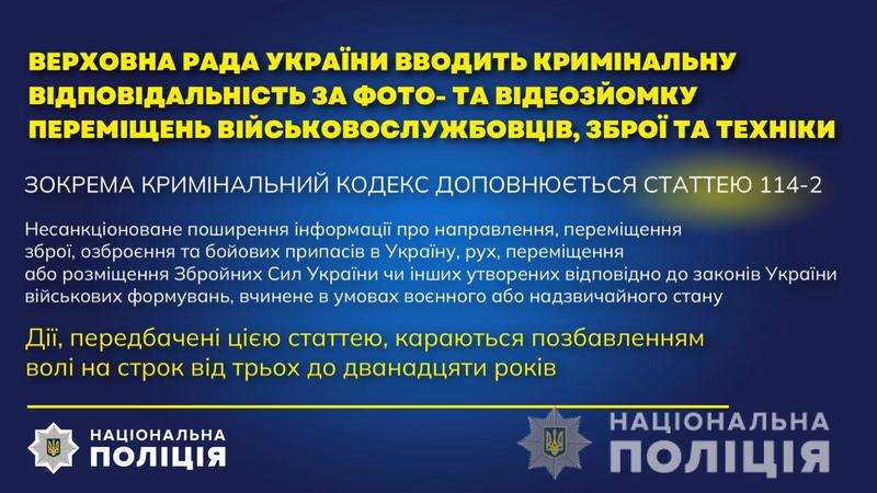 Відтак Кримінальний кодекс доповнюється статтею 114-2: несанкціоноване поширення інформації про направлення, переміщення зброї, озброєння та бойових припасів в Україну, рух, переміщення або розміщення Збройних Сил України чи інших утворених відповідно до законів України військових формувань, вчинене в умовах воєнного або надзвичайного стану.
