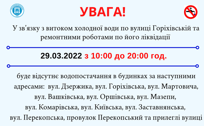 У Чернівцях в зв’язку з проведенням ремонтних робіт по ліквідації витоків холодної води та заміни запірної арматури по вул. Горіхівській 29 березня 2022 року з 10.00 до 20.00 год. буде відключене водопостачання до будинків по вулицях: