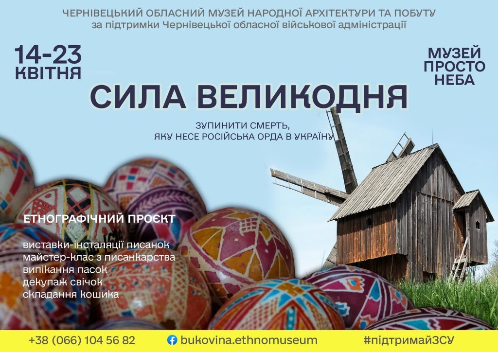 З 14 до 23 квітня у Чернівецькому обласному музеї народної творчості та побуту презентують етнографічний проєкт «Сила Великодня». У рамках проєкту будуть виставки-інсталяції святкових вишиванок, майстер-класи з писанкарства, випікання пасок, складання великоднього кошика тощо.