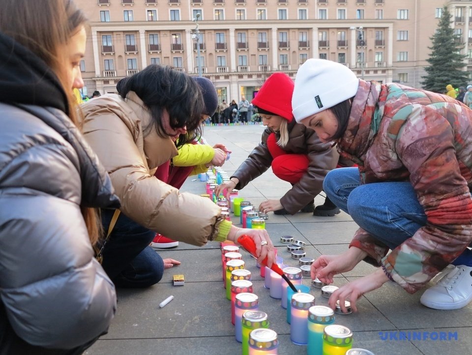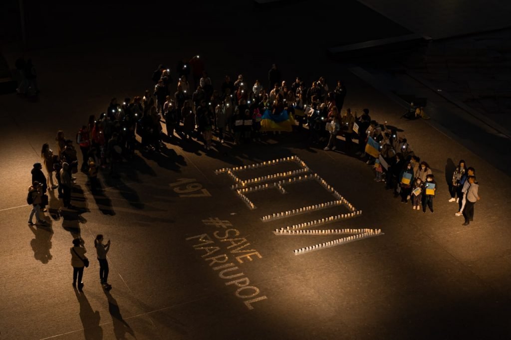 По периметру напису «Діти» виклали та запалили яскраві різнокольорові свічки, на згадку про те, що в Маріупольському театрі ховалося багато дітей. Також свічками виклали слова Save Mariupol Ukraine.