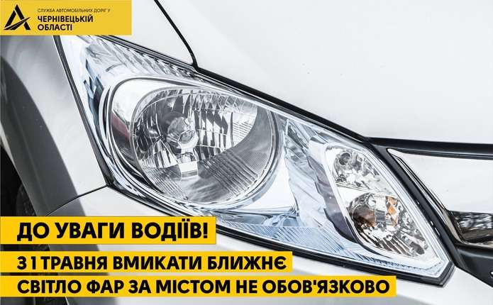 З 1 травня ближнє світло фар у світлу пору доби не є обов’язковим на заміських дорогах. Так звана «зимова» редакція правил дорожнього руху перестала діяти. Про це повідомляє служба автомобільних доріг у Чернівецькій області.