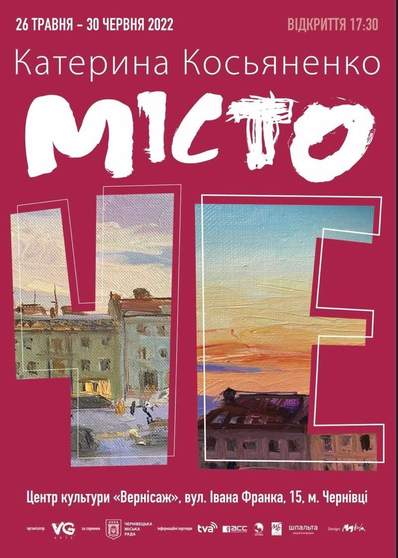 26 травня 2022 року, о 17:30 годині, в центрі культури «Вернісаж» (вул. Івана Франка, 15, м. Чернівці) відбудеться відкриття персональної виставки живопису заслуженої художниці України Катерини Косьяненко «Місто Че».