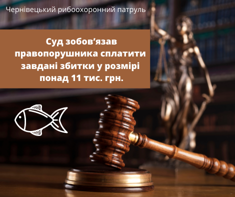 2 червня 2022 року Кельменецьким районним судом Чернівецької області було задоволено цивільний позов Чернівецького рибоохоронного патруля про відшкодування шкоди, завданої внаслідок порушення природоохоронного законодавства. Даним рішенням суд зобов’язав правопорушника сплатити завдані збитки у розмірі 11 275 грн, а також 2 481 грн судового збору на користь держави.