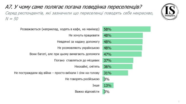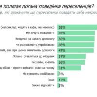 Найчастішою причиною негативного ставлення українців до переселенців є сприйняття, ніби вони розважаються на новому місці проживання (58%). Також майже половина респондентів вказали такі причини негативного ставлення як небажання переселенців працювати (48%), невдячність за надану допомогу (48%), те, що переселенці не розмовляють українською мовою (48%), та необхідність допомагати переселенцям, які самі мають високий рівень матеріального достатку (47%).