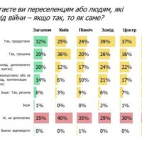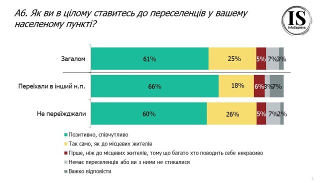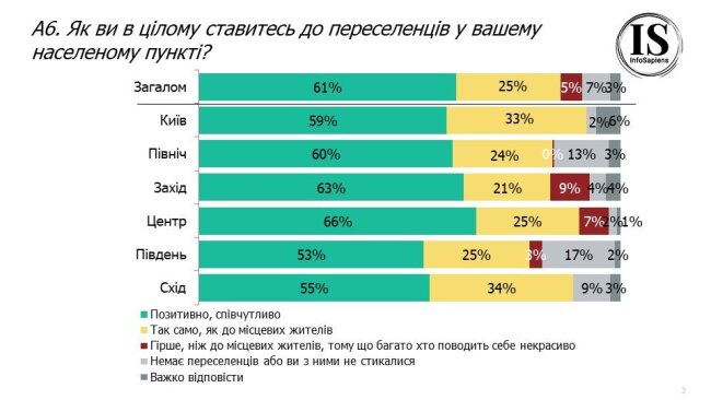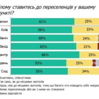 Люди, яким самим довелось переїхати в інше місто, співчувають більше – 66% опитаних, проти 60% тих, хто не переїжджав. Негативно ставляться до переселенців лише 6% українців. Проте, позитивне ставлення переважає в усіх регіонах.