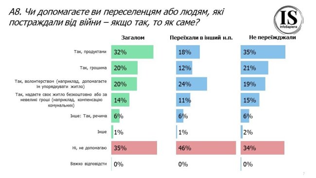 Люди, яким довелося переїхати в інший населений пункт, рідше надають допомогу іншим переселенцям ймовірно через те, що самі її потребують, але при цьому частіше надають допомогу через волонтерську діяльність (24%).