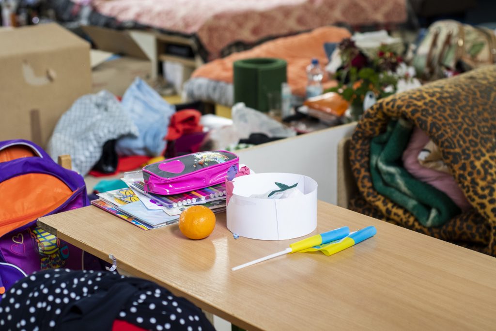 В одній із класних кімнат мешкає родина із Сєверодонецька — пані Олена та її син Мирослав. Вони жили у місті понад місяць попри постійні бомбардування та пропустили офіційну евакуацію. Сподівалися, що скоро все закінчиться.