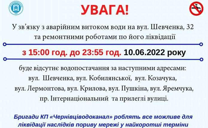 10 червня 2022 року у Чернівцях, в зв’язку з аварійним витоком по вулиці Шевченка, 32, до 24:00 години буде припинено водопостачання в районі вулиць: