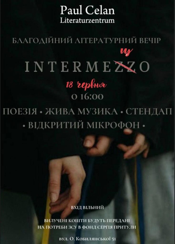 18 червня у Літературному целанівському центрі відбудеться вечір українського мистецтва, який організовує культурний простір «Intermeцо». Початок заходу о 16:00.