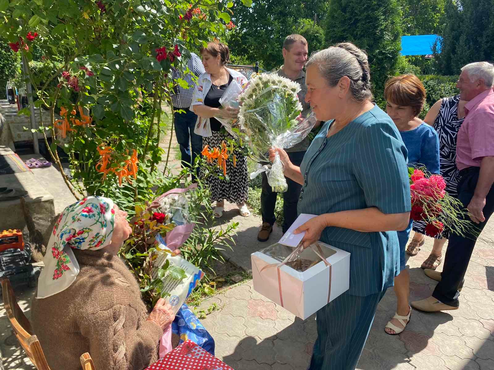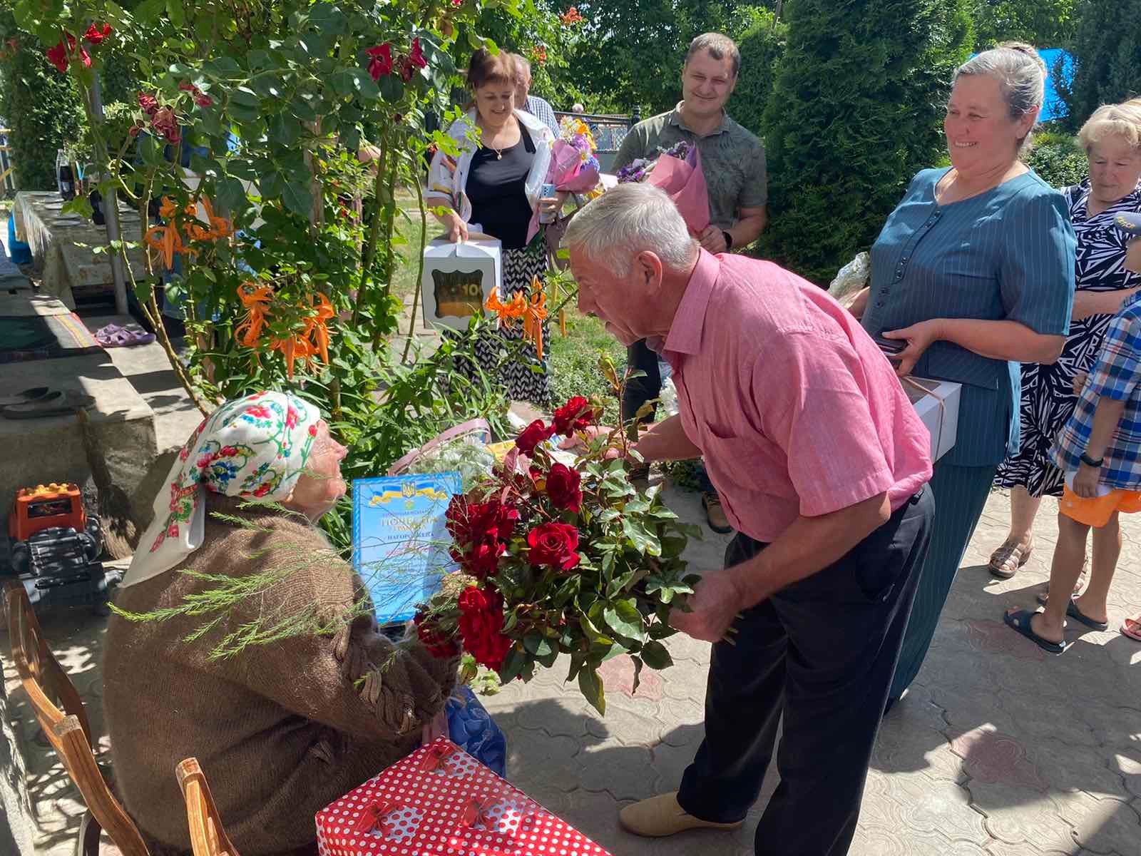З нагоди поважного ювілейного Дня народження гості висловили жінці слова вдячності і шани за багаторічну сумлінну працю, за мудрість та досвід, які вона передала своїм дітям, онукам та правнукам, та вручили квіти і подарунки.