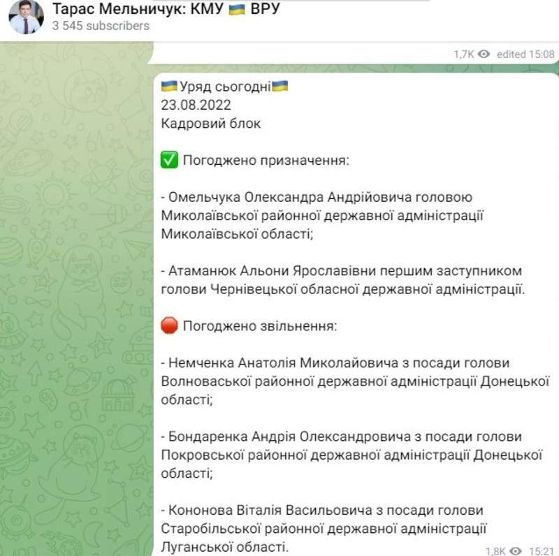 23 серпня 2022 року Кабінет міністрів погодив призначення першої заступниці голови Чернівецької ОДА. Про це повідомив представник Кабміну у Верховній Раді Тарас Мельничук.