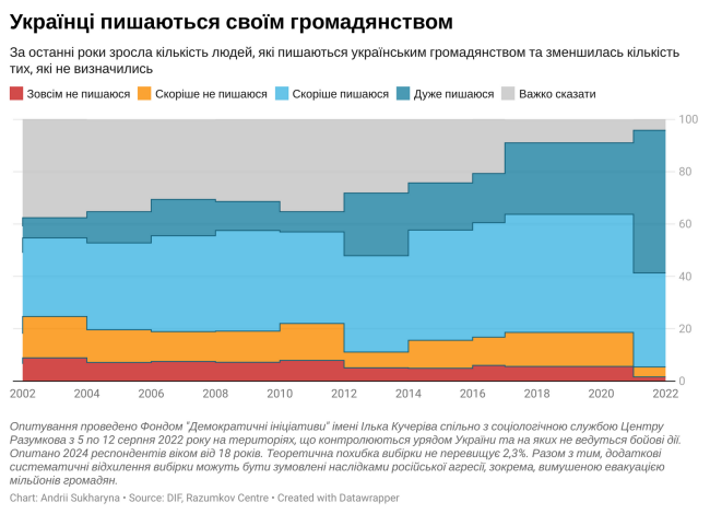 Так, згідно з результатами опитування понад 90% українців пишаються своїм громадянством і це найвищий показник за весь час соціологічного моніторингу, який проводився за часи незалежності України. Торік тих, хто скоріше або дуже пишався українським громадянством, було 72,4%.