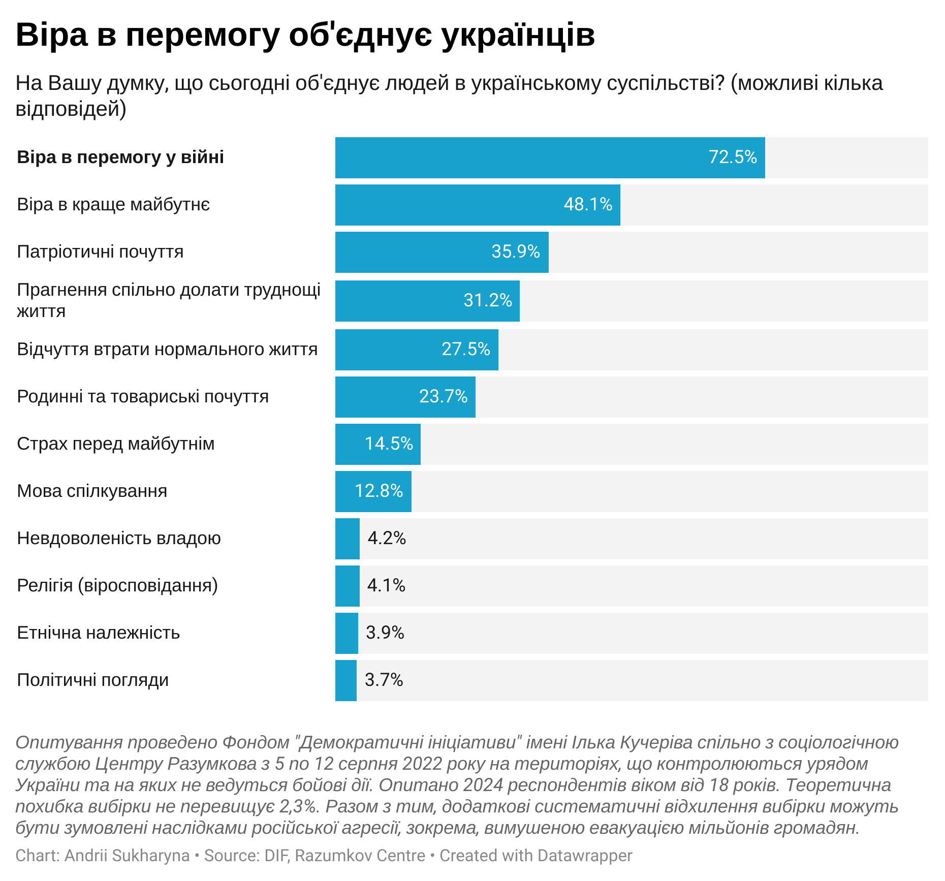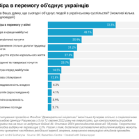 Окрім того, соціологи з’ясували, що найбільше українське суспільство об’єднує віра в перемогу у війні – так вважають 72,5% опитаних. Ще 48% згадують віру у краще майбутнє, а 36% – патріотичні почуття.
