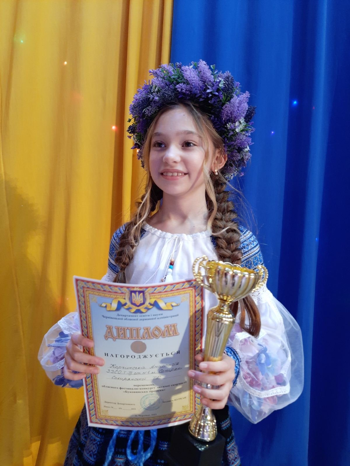 Отримуватиме стипендію також Анастасія Корчинська – учениця 6 класу закладу загальної середньої освіти І-ІІІ ступенів №1 м. Сокиряни. Юна сокирянка є переможницею обласного фестивалю-конкурсу «Рідна пісня», лауреатка ІІІ премії онлайн-конкурсу «Джерело надій». Також Анастасія здобула перше місце в обласному фестивалі-конкурсі дитячої творчості «Буковинська зіронька» та фестивалі-конкурсі вокально-хорової творчості композитора Михайла Мафтуляка «Свої пісні дарую людям».