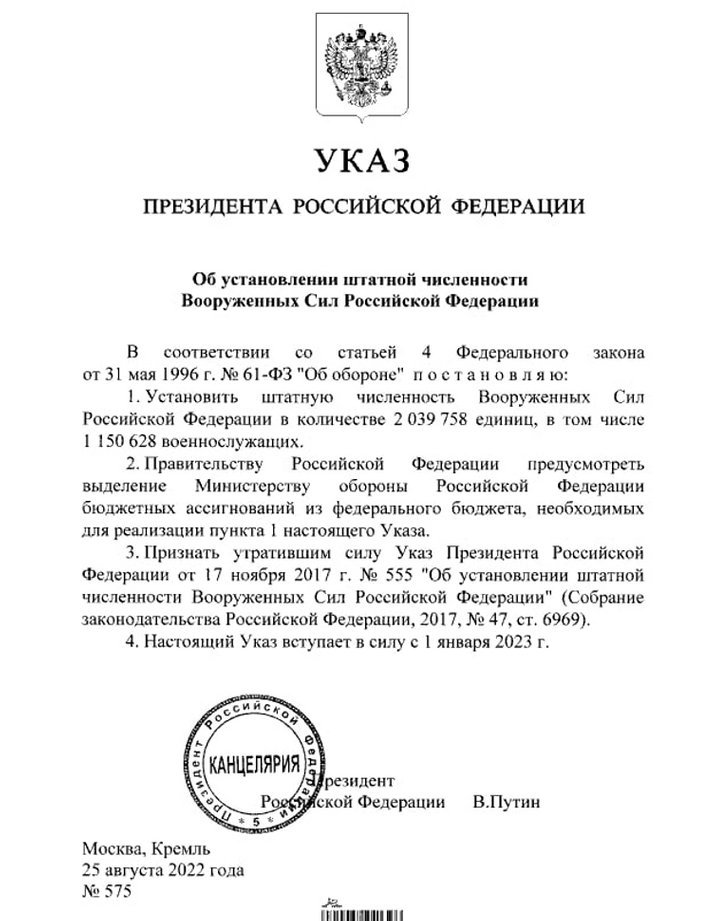 «Встановити штатну чисельність Збройних сил Російської Федерації в кількості 2 039 758 одиниць, у тому числі 1 150 628 військовослужбовців», — йдеться в указі.
